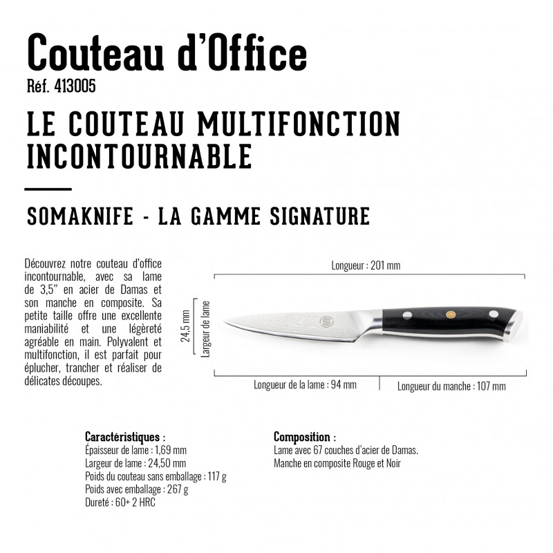 Découvrez notre couteau d'office incontournable, avec sa lame de 3,5" en acier Damas et son manche en composite noir. Sa petite taille offre une maniabilité exceptionnelle et une légèreté agréable en main.