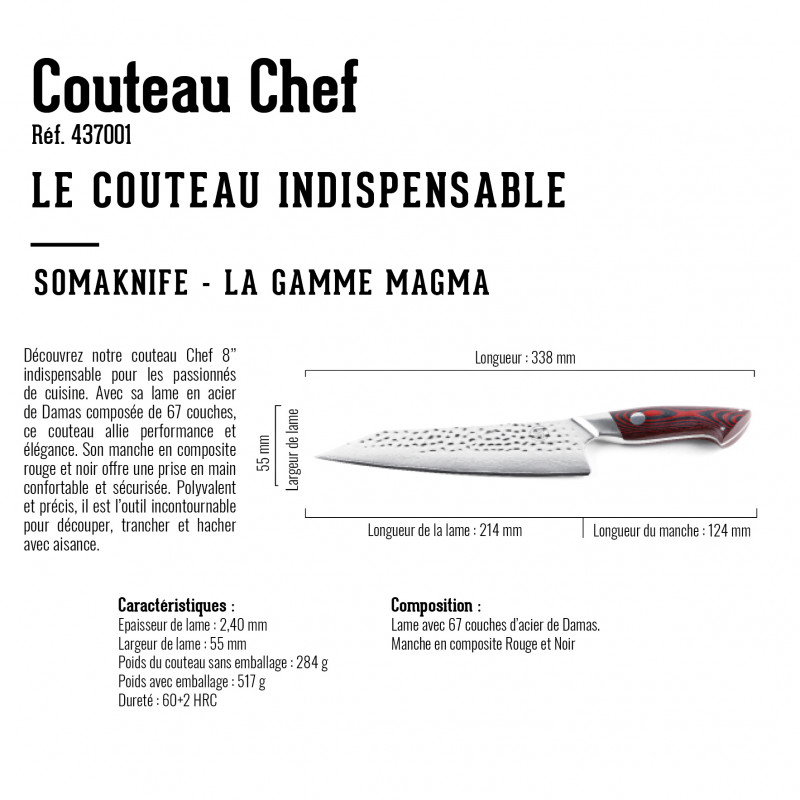 Découvrez notre couteau Chef 8" indispensable pour les passionnés de cuisine. Avec sa lame en acier Damas, ce couteau allie performance et élégance. Son manche en composite rouge et noir offre une prise en main confortable et sécurisée.