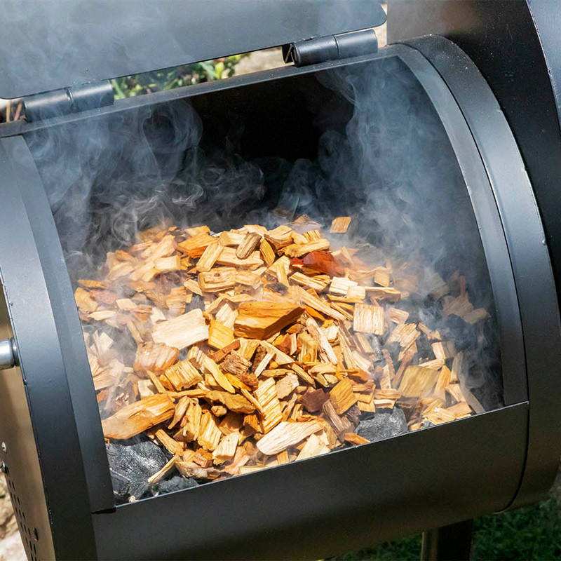 Barbecue à charbon de bois en acier avec fumoir et cheminée et couvercle de cuisson, grilles en acier chromé, sur chariot.