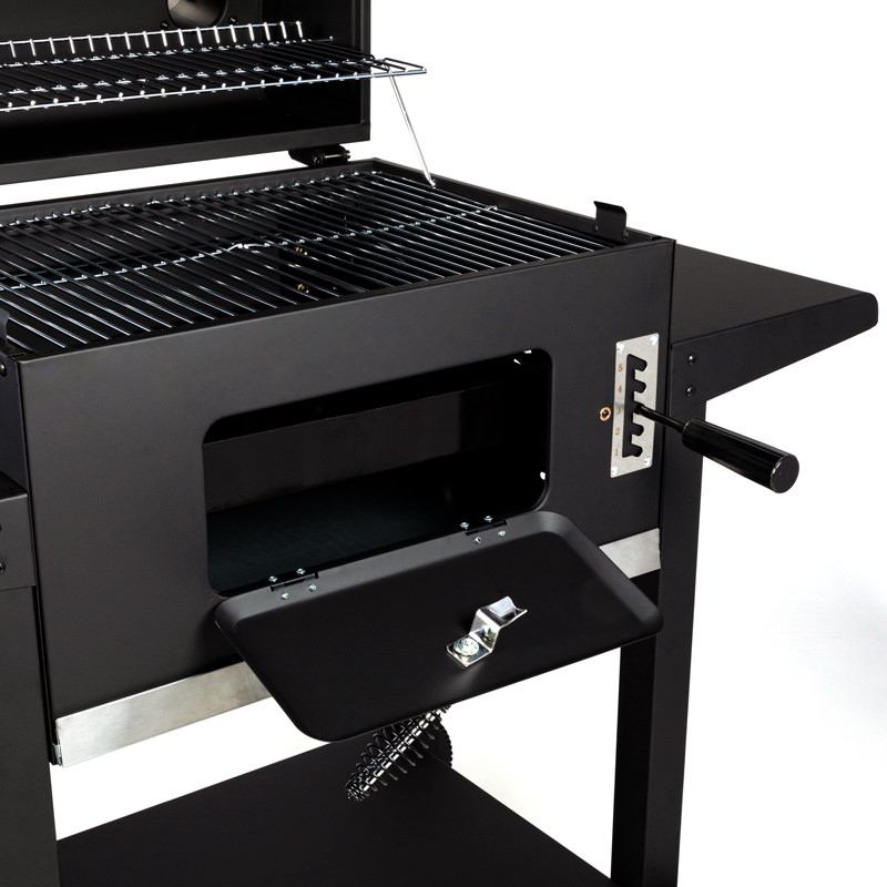 Barbecue à charbon de bois, châssis en acier avec cuve foyère en acier émaillé réglable par système de crémaillère, couvercle de cuisson, grilles en acier chromé , sur chariot. Pour 12 personnes.