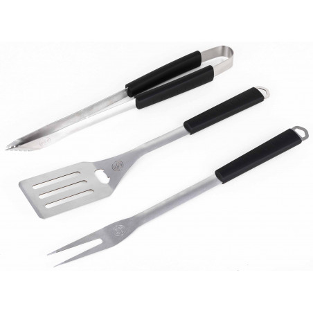Lot de 3 accessoires en acier inoxydable avec manche soft touch pour cuisson au barbecue et à la plancha.